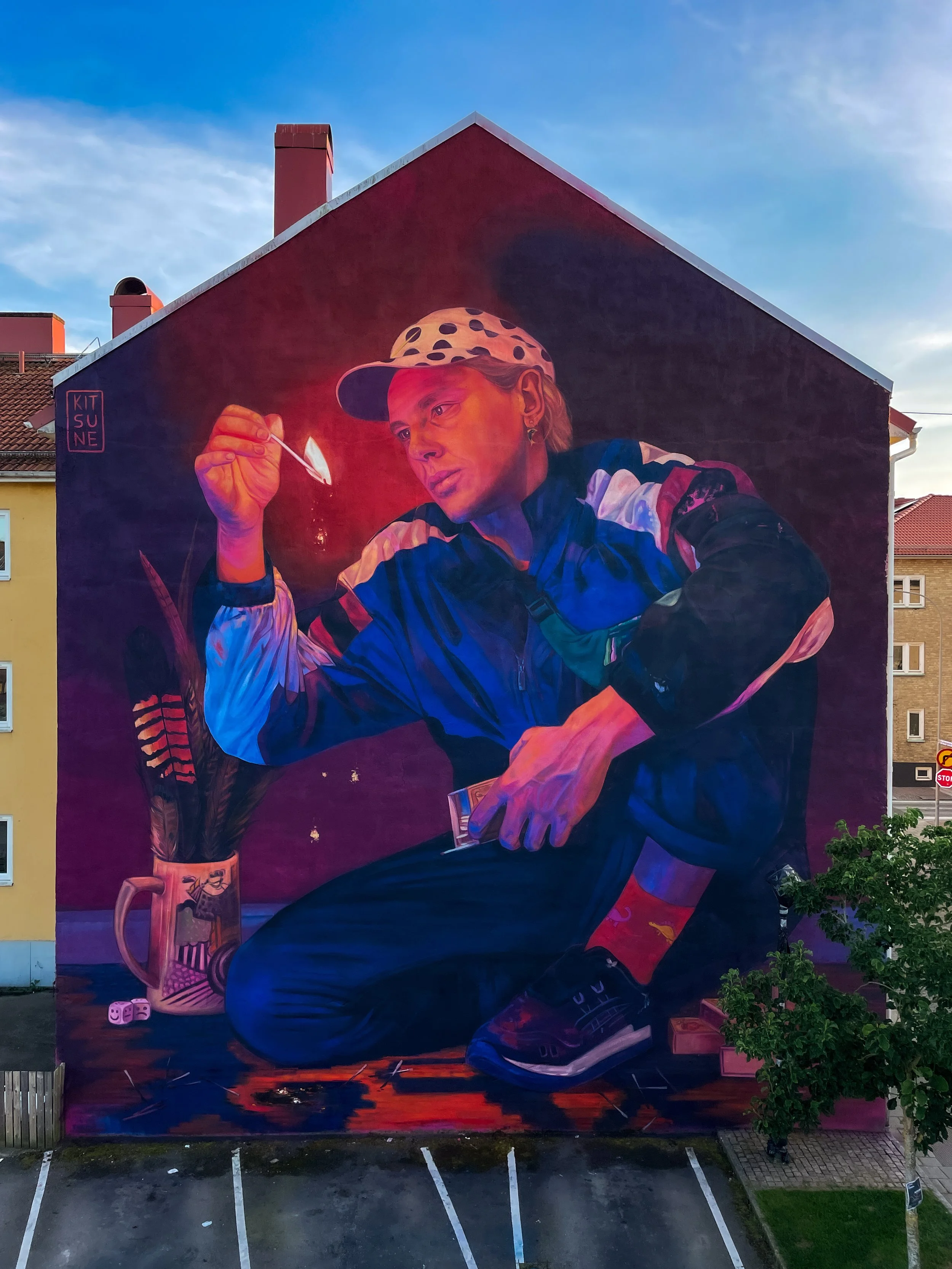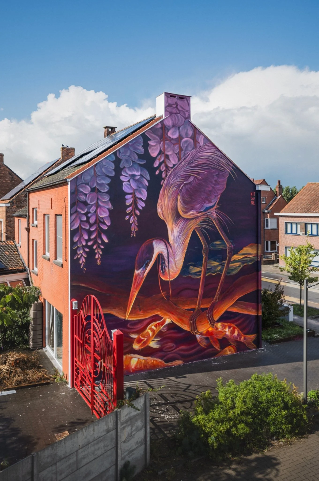Kitsune - Jolien De Waele (1992) a Belgian international muralist and painter. Known for dreamy and emotive visual storytelling in a recognizable vibrant palette. She pulls inspiration from the human experience and her own personal exploration through life, which results in paintings overflowing with emotion. She often plays with contrasting intimate softness and bold colours in the public space.